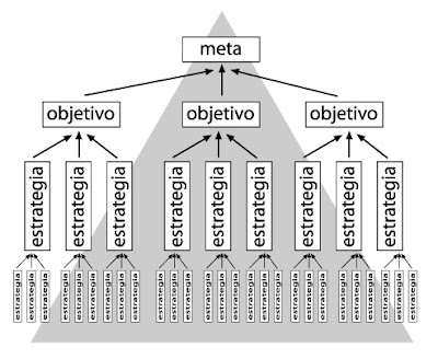 La idea es que cada meta a largo plazo tenga respectivamente una lista de objetivos pequeños a corto plazo que servirán para llegar a ella. De esta manera iremos desarrollando una planeación estratégica en forma de una pirámide, donde la punta es nuestra meta a largo plazo. Luego debemos definir cómo llegaremos a ella. Estas estrategias serán el segundo nivel en nuestra pirámide de planeación.